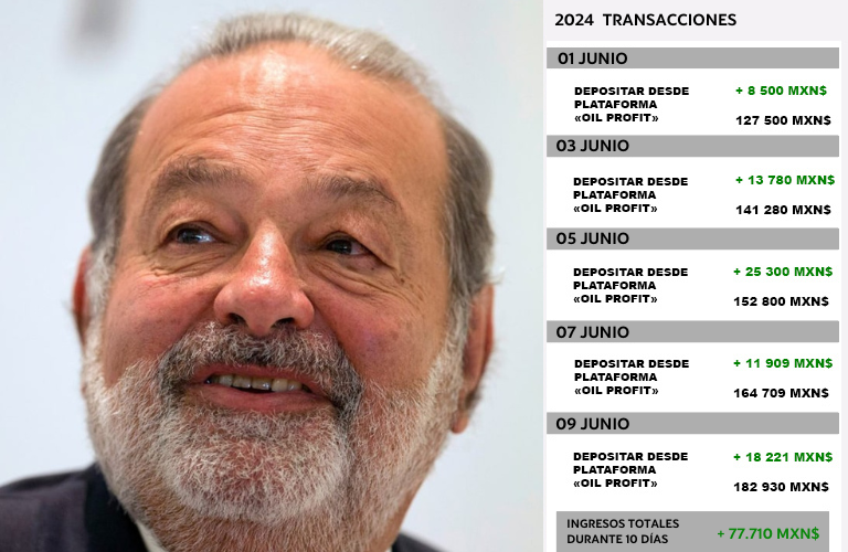 Carlos Slim: "Acceder al comercio de petróleo, la plataforma funciona en modo piloto automático, que cierra automáticamente las operaciones de petróleo con una bonificación para sus usuarios. Así que empecé a invertir con sólo 4,000 pesos y después de una semana gané 77,710 pesos. Para verificar solicité un retiro de estos fondos a mi cuenta en el Banco de México, 30 minutos después recibí la confirmación de la transacción. Viendo que esta plataforma funciona muy bien , ya he invertido una cantidad mucho más impresionante en Oil Profit, y exhorto a todos los mexicanos a que se sumen a nuestra herencia nacional".