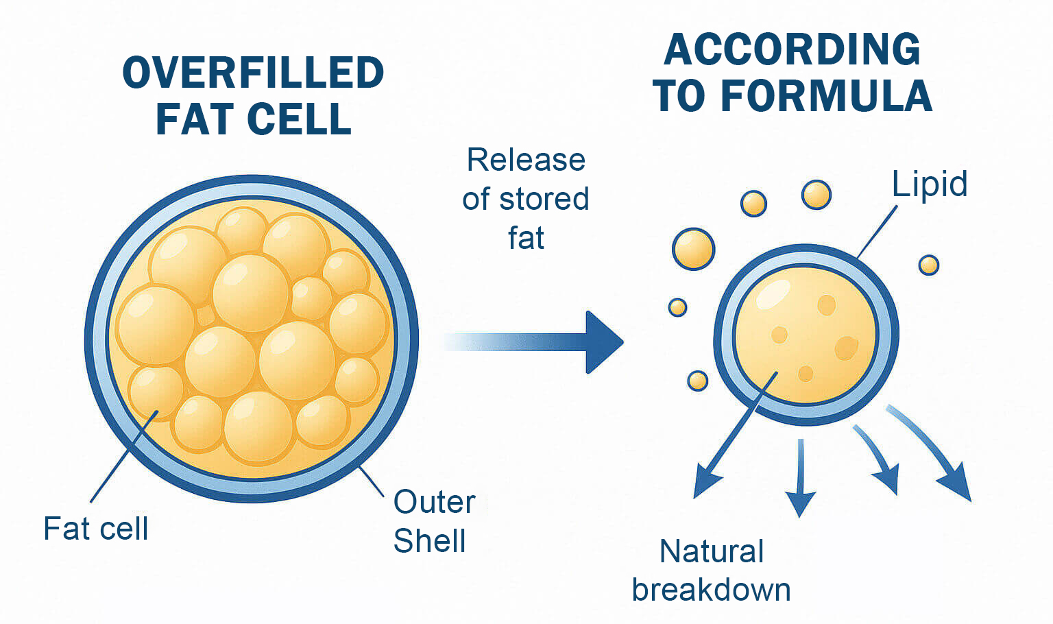 The formula specifically dissolves the outer shell of overfilled fat cells, allowing the body to naturally break down and burn the stored fat – without slowing down the metabolism as is the case with injections.