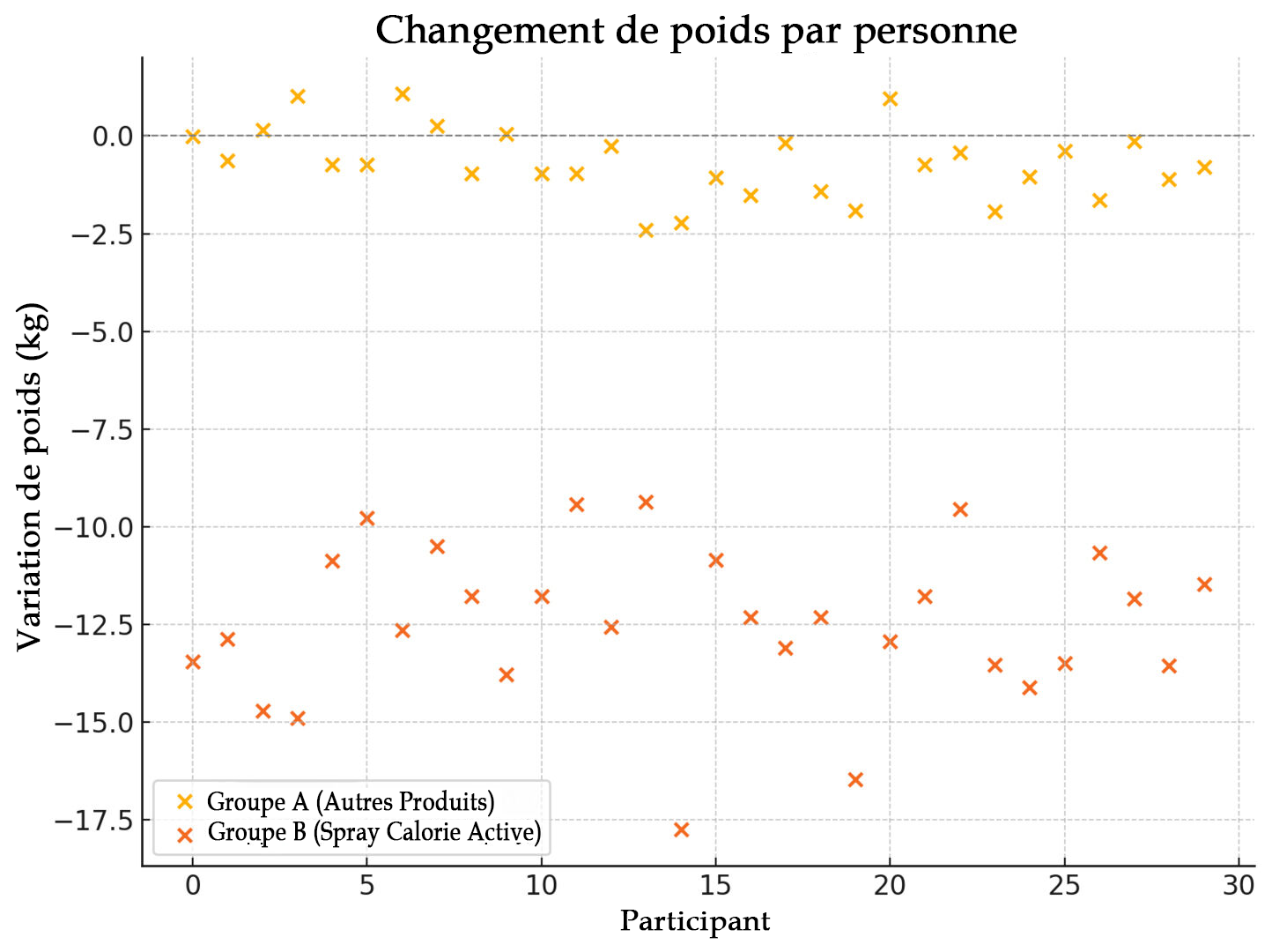 Alors que les participants du groupe A (produit diététique conventionnel) n'ont pratiquement pas perdu de poids, presque tous les sujets du groupe B (groupe Calorie Active Spray) ont perdu en moyenne jusqu'à 12 kilos.
